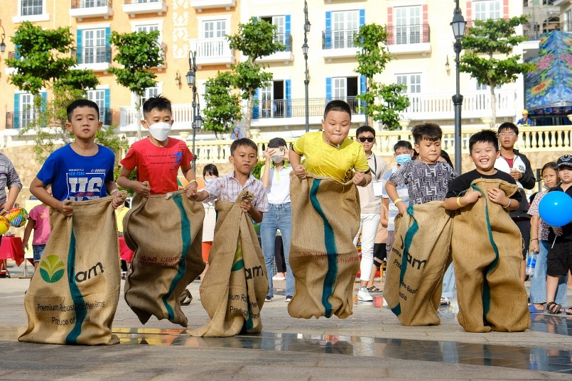 Nhanh chóng, các bạn nhỏ đã bị thu hút bởi các khu vực trò chơi dân gian như kéo co, nhảy bao bố, ô ăn quan… Không khí lễ hội nóng bừng với nhịp hò dô của người dẫn chương trình, tiếng reo hò cổ vũ của “khán giả” bố mẹ đứng xung quanh, đặc biệt là tiếng cười giòn tan đầy khoái trí của các bạn nhỏ.