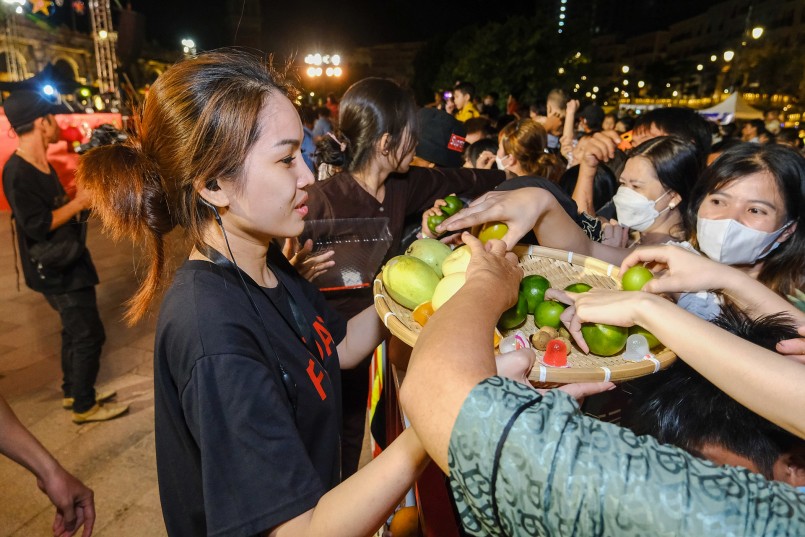 Buổi tối ở Thị trấn Địa Trung Hải mát rượi với những cơn gió biển, song không khí lại “nóng” hơn bao giờ hết khi hàng nghìn người cùng nhau phá mâm cỗ Trung thu khổng lồ. Hàng nghìn phần bánh nướng, bánh dẻo, kẹo cùng nhiều thức quả mùa thu được chưa đưa tận tay mọi người.