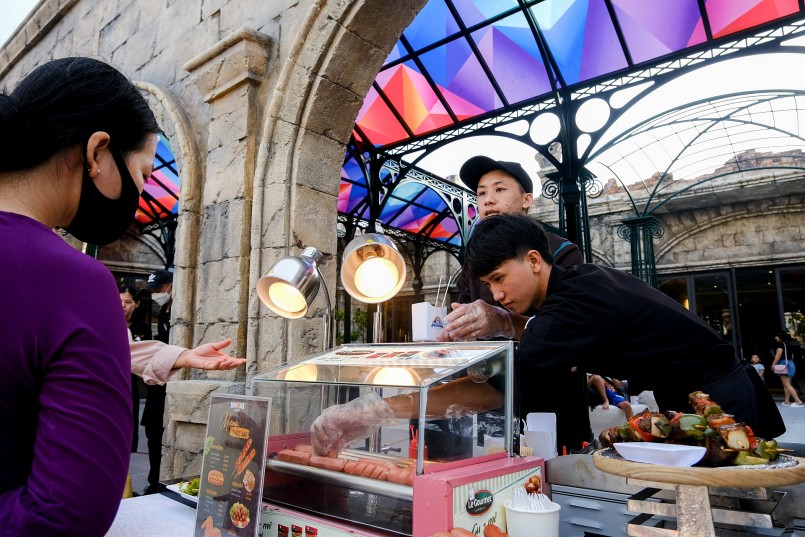Bên trong quảng trường nhà ga An Thới được trang hoàng lộng lẫy với những chiếc đèn ông sao, đèn lồng trang trí Trung thu. Ai nấy đều hào hứng tham quan 30 gian hàng, thưởng thức những món ngon như cup cake nhiều màu sắc, thịt nướng và chọn quà ở các gian hàng đồ lưu niệm, đèn lồng.