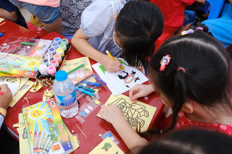 Nhiều bạn nhỏ khác hào hứng với quầy đọc sách, vẽ tranh và làm đèn Trung thu. Ban tổ chức đã chuẩn bị hàng trăm bộ tranh và bút nước, bút màu sáp, những bộ giấy bóng kính… để trẻ thỏa sức sáng tạo với đèn lồng hay mặt nạ con vật ngộ nghĩnh mèo con, cún con…
