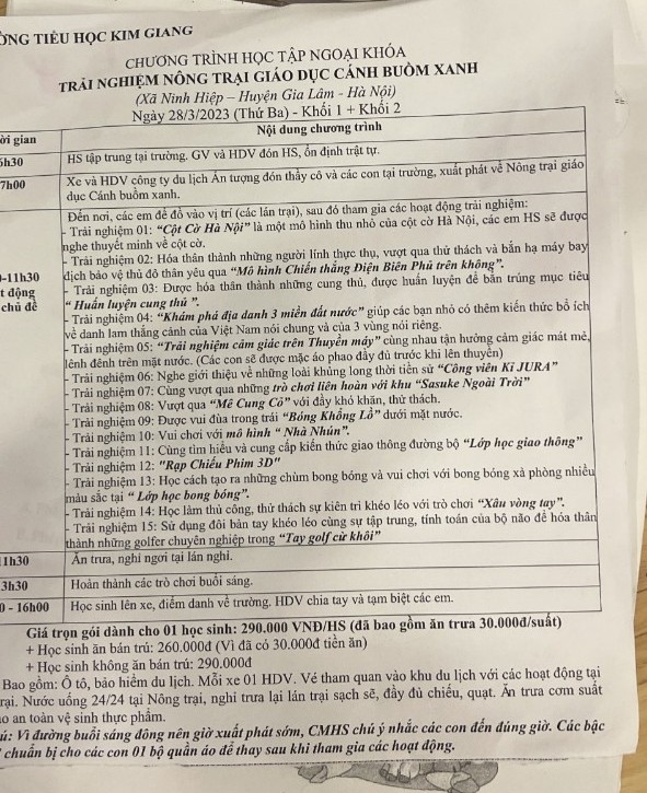 Theo Chi cục An toàn vệ sinh thực phẩm Hà Nội, sáng 28/3, Trường Tiểu học Kim Giang tổ chức cho 915 học sinh khối 1 và khối 2 đi tham quan tại Nông trại giáo dục Cánh Buồm Xanh (ở xã Ninh Hiệp, huyện Gia Lâm, Hà Nội).