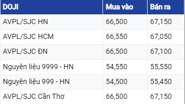 Vàng DOJI tại khu vực Hà Nội đang niêm yết ở mức 66,50 triệu đồng/lượng mua vào và 67,15 triệu đồng/lượng mua vào thấp hơn 50.000 đồng/ lượng ở chiều mua vào và tăng lên 100.000 đồng/ lượng ở bán ra so với chốt phiên ngày hôm qua.