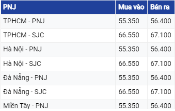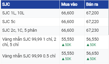Vàng SJC ở khu vực Hà Nội và Đà Nẵng đang mua vào mức 66,5 triệu đồng/lượng và bán ra mức 67,22 triệu đồng/lượng. Tại TP Hồ Chí Minh, vàng SJC vẫn đang mua vào mức tương tự như ở khu vực Hà Nội và Đà Nẵng nhưng bán ra thấp hơn 20.000 đồng.