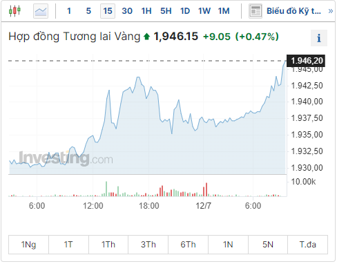 Đây là phiên tăng thứ ba liên tiếp của giá vàng giao ngay, tăng 0,47% lên 1.946,15 USD/ounce vào lúc 09:32 sáng ngày 12/07/2023.