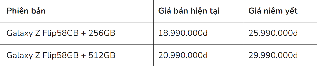 Giá của thiết bị trên gian hàng Lazada của SAMSUNG Flagship Store đang có giá của Galaxy Z Flip 5 phiên bản 8GB + 256GB ở mức 18.990.000đ. Đã giảm 7 triệu đồng tương đương với mức giám 27% so với mốc 25.990.000đ ở thời điểm ra mắt.