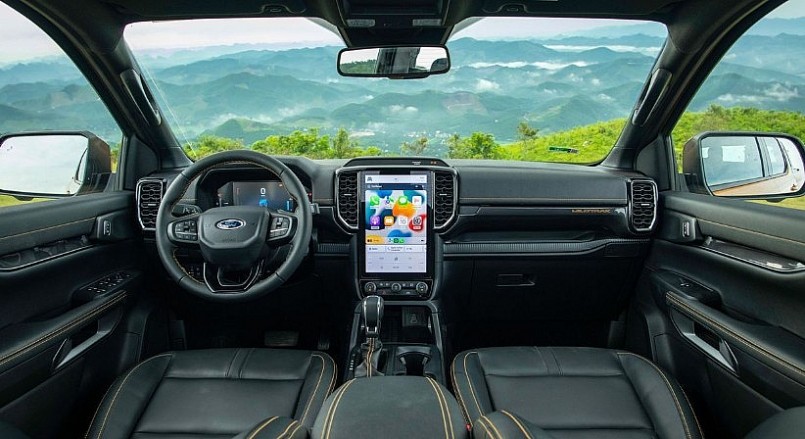 Tiến vào khoang nội thất, Ford Ranger thế hệ mới được hãng "lột xác" hoàn toàn so với đời cũ khi được hãng sử dụng vật liệu cao cấp và tiện nghi. Khu vực táp-lô được trang bị màn hình giải trí trung tâm 12 inch có độ phân giải cao và kết nối Apple CarPlay/Android Auto và hệ thống giải trí giải trí SYNC®i 4.