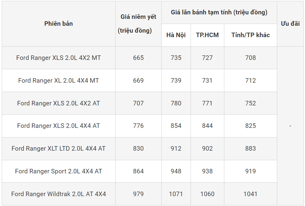 Ford Ranger là mẫu xe ô tô đến từ nước Mỹ cùng với đó là động cơ mạnh mẽ và ngoại hình thiết kế thể thao, hầm hố. Nhằm giữ vững vị thế số 1 phân khúc và đem đến cho người dùng một mẫu bán tải mạnh mẽ và đa năng, Ford Ranger thế hệ hoàn toàn mới đã ra mắt khách hàng Việt vào tháng 8/2022 với 6 tùy chọn và có giá khởi điểm từ 659 triệu đồng. Đến tháng 5/2023, Ford Việt Nam bổ sung thêm phiên bản Sport và đồng thời cũng điều chỉnh giá xe theo hướng tăng thêm đáng kể.