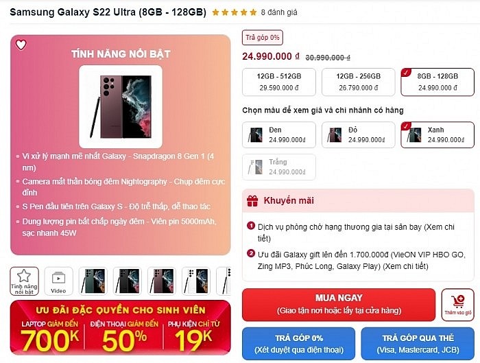 Samsung Galaxy S22 Ultra - 8GB/128GB: 24.990.000 đồng