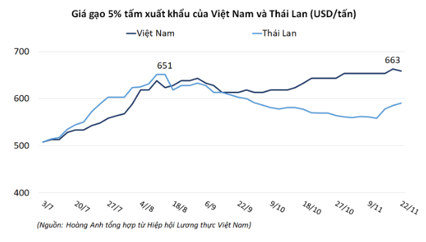 Tuy vậy, mức giá này vẫn cao hơn hàng cùng loại của Thái Lan và Pakistan lần lượt là 68 USD/tấn và 75 USD/tấn. Trong thời gian gần đây, giá gạo của hai đối thủ liên tục phục hồi khiến chênh lệch có xu hướng thu hẹp lại so với mức gần 100 USD/tấn vào đầu tháng 11.