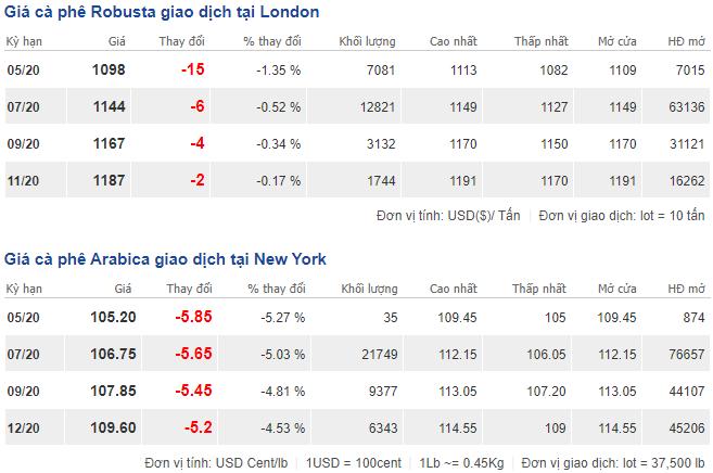 Trong khi tại New York, giá cà phê arabica tháng 5/2020 tăng 0,45 cent/lb (mức tăng 0,41%) giao dịch ở mức 111.05 cent/lb.