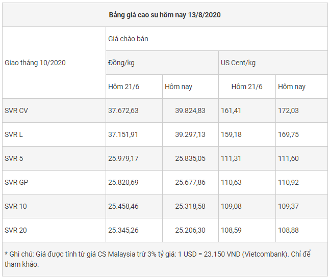 Giá cao su kỳ hạn tháng 9/2020 trên sàn Thượng Hải ở mức 10.515 CNY/tấn, tăng 35 CNY so với giá hôm qua. Giá kỳ hạn tháng 1/2021 giảm 70 CNY xuống 12.330 CNY/tấn.
