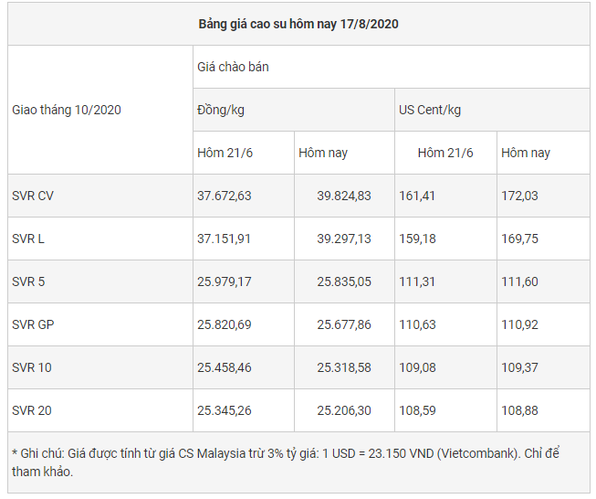 Cục chế biến và phát triển thị trường nông sản (Bộ NN&PTNT) cho biết khối lượng xuất khẩu cao su tháng 7/2020 ước đạt 180.000 tấn, giá trị 217 triệu USD, đưa khối lượng xuất khẩu cao su 7 tháng đầu năm 2020 đạt 662.000 tấn, giá trị 855 triệu USD, giảm hơn 15% về khối lượng và giảm 20,3% về giá trị so với cùng kì năm 2019.