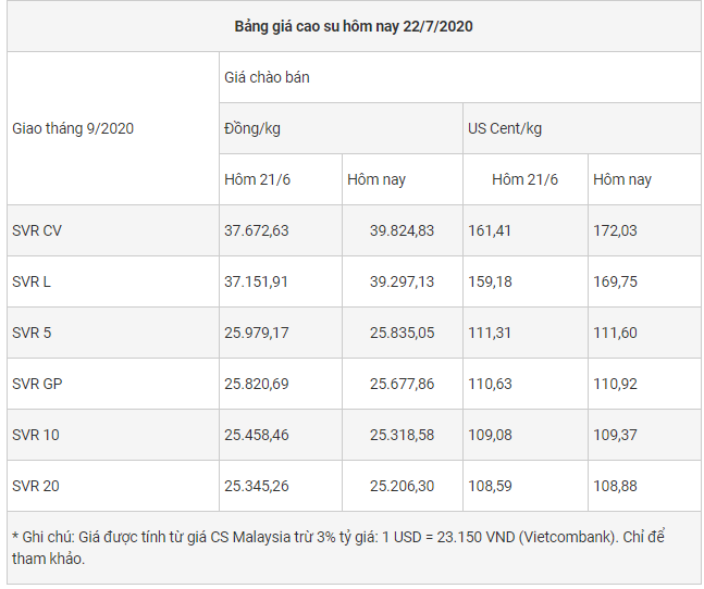 Sở giao dịch hàng hóa Tokyo (TOCOM), ngày 8/7, giá cao su RSS3 giao kì hạn tháng 8/2020 giao dịch ở mức 144,9 Yên/kg (tương đương 1,35 USD/kg), tăng 1,3% so với cuối tháng 6/2020, nhưng giảm 36,2% so với ngày 8/7/2019.