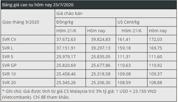 Giá cao su thế giới hôm nay tiếp tục giao dịch khá trầm lắng, giá kỳ hạn tháng 10 - 11/2020 giảm nhẹ nhưng không đáng kể. Tâm lý các nhà đầu tư được củng cố khi thị trường có nhiều tin tốt về vắc xin cho COVID-19, gói kích thích kinh tế của EU hay sự suy yếu của đồng Yên Nhật.