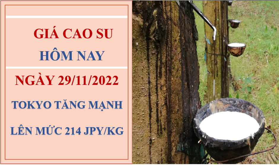 Tại Sở giao dịch hàng hóa Tokyo, giá cao su ngày 29/11/2022, lúc 12h00, kỳ hạn tháng 1/2023, tăng lên mức 214 JPY/kg, tăng nhẹ 0,1 yên, tương đương 0,05%.
