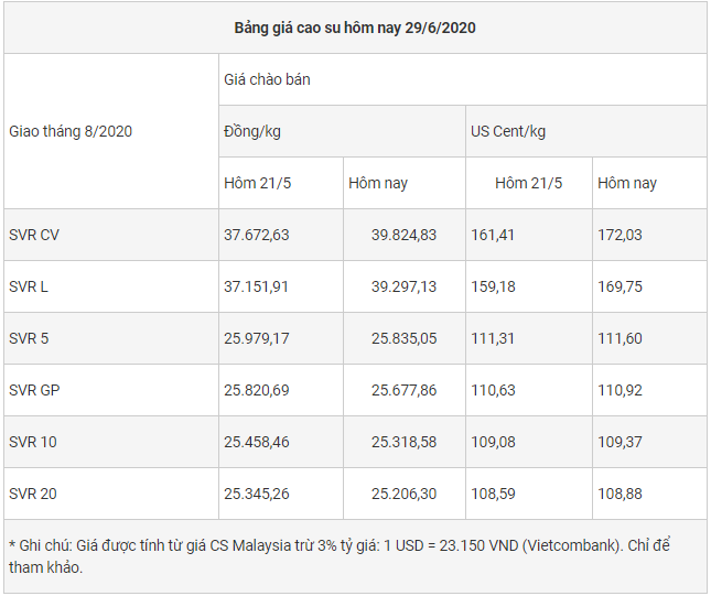 Trong khi đó giá cao su Nhật Bản kỳ hạn tháng 10/2020 hiện ở mức 148,5 JPY/kg, giao dịch cao nhất đạt 150,2 JPY/kg, thấp hơn giá hôm qua 1 JYP/kg.