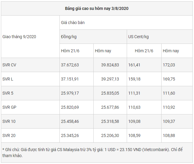 Giá cao su kỳ hạn tháng 9/2020 trên sàn Thượng Hải giảm 160 CNY xuống 10.865 CNY/tấn, trong phiên trước đó đạt mức cao nhất kể từ đầu tháng 3/2020. Giá cao su kỳ hạn tháng 1/2021 ở mức 11.620 CNY/tấn.