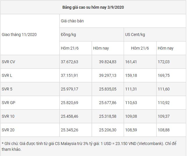 Cục chế biến và phát triển thị trường nông sản (Bộ NN&PTNT) cho biết khối lượng xuất khẩu cao su tháng 7/2020 ước đạt 180.000 tấn, giá trị 217 triệu USD, đưa khối lượng xuất khẩu cao su 7 tháng đầu năm 2020 đạt 662.000 tấn, giá trị 855 triệu USD, giảm hơn 15% về khối lượng và giảm 20,3% về giá trị so với cùng kì năm 2019.