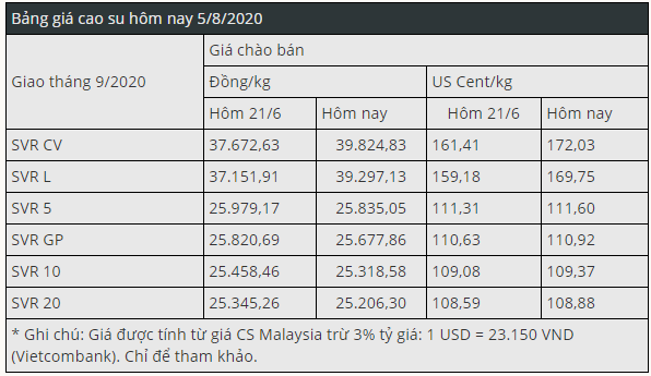 Cục Xuất nhập khẩu (Bộ Công Thương) cho biết, tháng 7/2020, xuất khẩu cao su của Việt Nam ước đạt 180 nghìn tấn, trị giá 217 triệu USD, tăng 32% về lượng và tăng 33,6% về trị giá so với tháng 6/2020, tăng 7,9% về lượng, nhưng giảm 6,9% về trị giá so với tháng 7/2019; giá xuất khẩu bình quân giảm 13,7% so với cùng kỳ năm 2019, xuống còn 1.206 USD/tấn.
