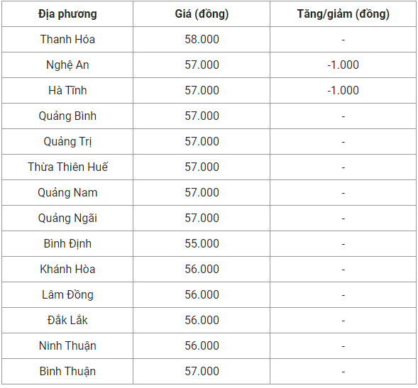 Các tỉnh còn lại duy trì thu mua ổn định trong khoảng 56.000 - 57.000 đồng/kg.