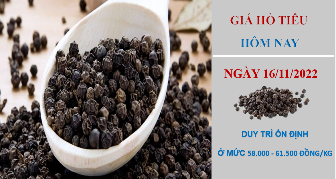Giá hồ tiêu hôm nay 16/11/2022, thị trường trong nước đứng yên tại các địa phương so với cùng thời điểm hôm qua. Hiện giá hồ tiêu dao động trong khoảng từ 58.000 - 61.500 đồng/kg.