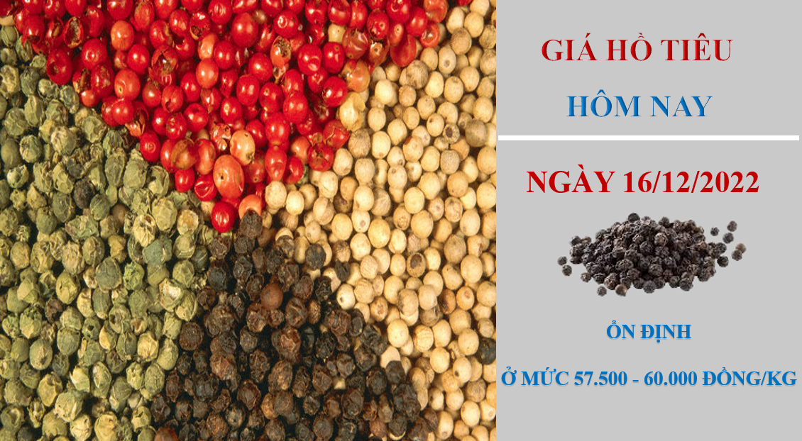 Giá hồ tiêu hôm nay 16/12/2022, đi ngang tại các địa phương so với cùng thời điểm hôm qua, sau khi có chuỗi giảm 3 ngày liên tiếp từ đầu tuần. Hiện giá hồ tiêu đang dao động trong khoảng 57.500 - 60.000 đồng/kg.