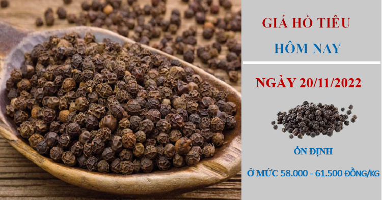 Giá hồ tiêu hôm nay 20/11/2022, thị trường trong nước đứng yên tại các vùng trồng trọng điểm so với cùng thời điểm hôm qua. Hiện giá hồ tiêu đang dao động trong khoảng 58.000 - 61.500 đồng/kg.