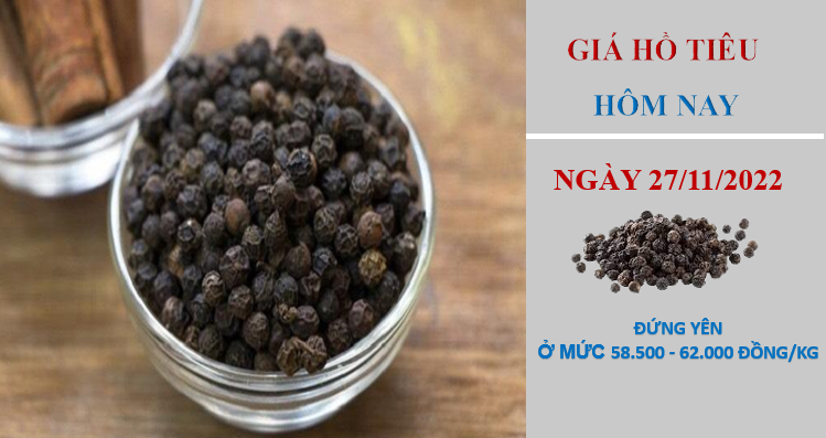 Giá hồ tiêu hôm nay 27/11/2022, đi ngang ở các địa phương trọng điểm so với cùng thời điểm hôm qua. Tổng kết tuần, giá tiêu trong nước tăng 500 đồng/kg. Hiện giá hồ tiêu đang dao động trong khoảng 58.500 - 62.000 đồng/kg.