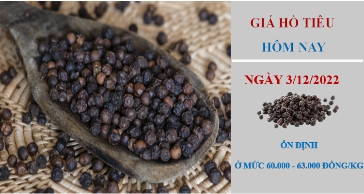 Giá hồ tiêu hôm nay 3/12/2022, thị trường trong nước đi ngang tại những địa phương trọng điểm so với cùng thời điểm hôm qua. Hiện giá hồ tiêu đang dao động trong khoảng 60.000 - 63.000 đồng/kg.