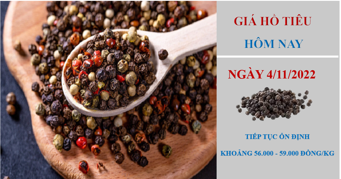 Giá hồ tiêu hôm nay 4/11/2022, thị trường trong nước không có thay đổi mới so với cùng thời điểm hôm qua. Hiện giá hồ tiêu dao động trong khoảng từ 56.000 - 59.000 đồng/kg.