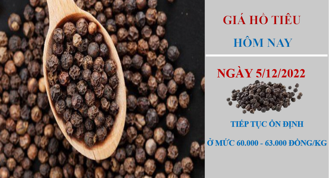 Giá hồ tiêu hôm nay 5/12/2022, không có thay đổi mới tại các địa phương so với hôm qua. Hiện giá hồ tiêu đang dao động trong khoảng từ 60.000 - 63.000 đồng/kg.