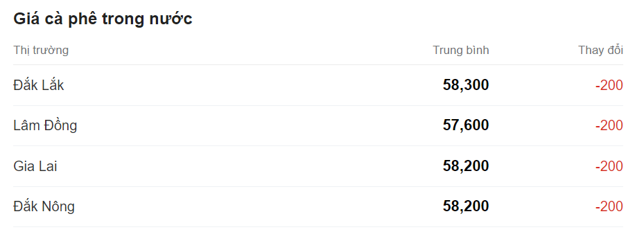 Giá cà phê hôm nay (11/11), ghi nhận quay đầu giảm 200 đồng/kg, hiện giao dịch trung bình ở mức 58.100 đồng/kg.