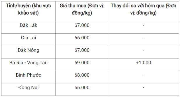 Đồng thời, nông dân tại Đắk Lắk và Đắk Nông tiếp tục thu mua với mức giá chung 67.000 đồng/kg.