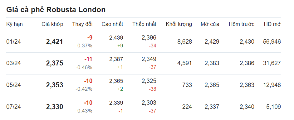 Theo ghi nhận, giá cà phê trên thị trường thế giới giảm. Theo đó, giá cà phê trực tuyến robusta tại London giao tháng 1/2024 được ghi nhận tại mức 2.421 USD/tấn sau khi giảm 0,37% (tương đương 9 USD).