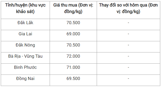 Theo đó, Gia Lai và Đồng Nai đang ghi nhận mức giá lần lượt là 69.000 đồng/kg và 69.500 đồng/kg.