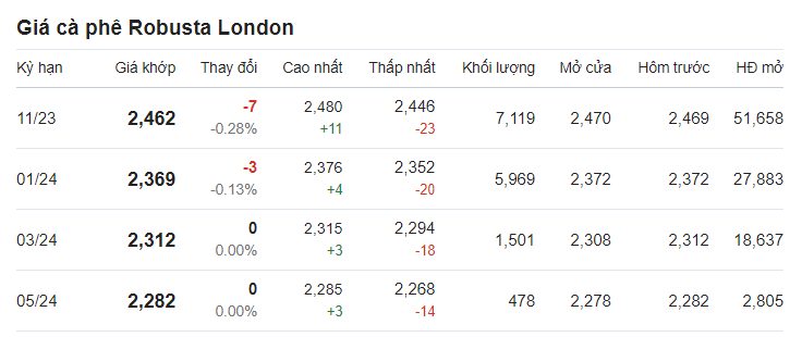 Theo ghi nhận, giá cà phê trên thị trường thế giới biến động trái chiều. Theo đó, giá cà phê trực tuyến robusta tại London giao tháng 11/2023 được ghi nhận tại mức 2.461 USD/tấn sau khi giảm 0,04% (tương đương 1 USD).