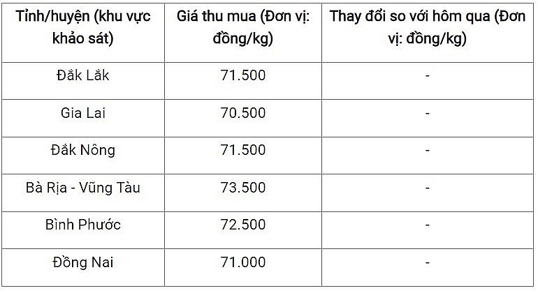 Tiếp theo đó là Đắk Lắk và Đắk Nông với mức giá chung 71.500 đồng/kg.