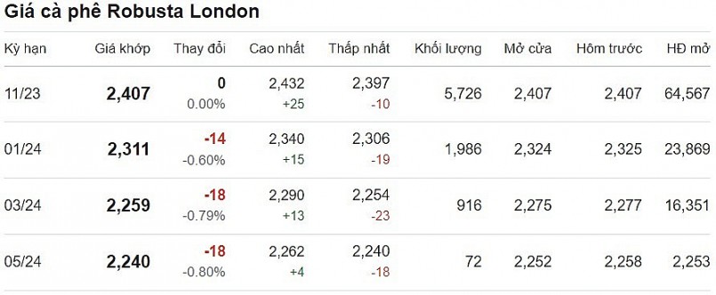 Theo ghi nhận, giá cà phê trên thị trường thế giới tương đối ổn định. Cụ thể, giá cà phê trực tuyến robusta tại London giao tháng 11/2023 được ghi nhận tại mức 2.407 USD/tấn, không đổi so với hôm qua.