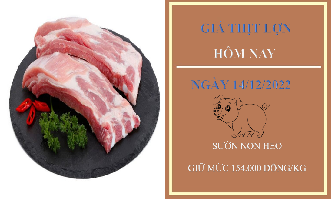 Giá thịt heo hôm nay 14/12/2022 ổn định trong khoảng 60.000 - 154.000 đồng/kg tại Công ty Thực phẩm bán lẻ. Trong đó, giá sườn già heo thấp hơn so với ba rọi heo, đuôi heo và sườn non heo với mức 100.000 đồng/kg.