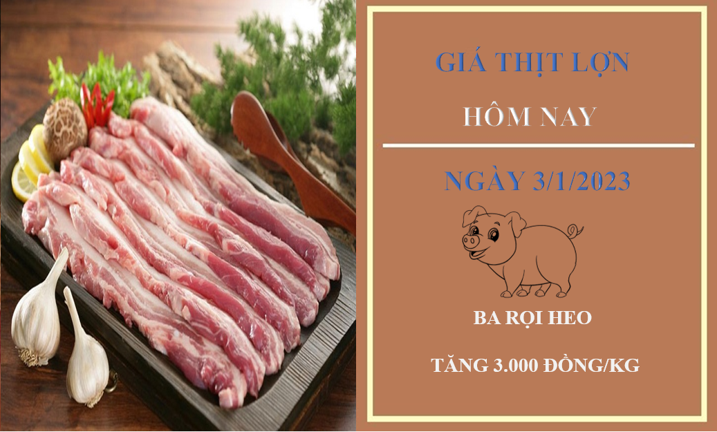 Giá thịt heo hôm nay 3/1/2023 tại Công ty Thực phẩm bán lẻ ghi nhận tăng giá ba rọi heo từ 111.000 đồng/kg nay lên mức 114.000 đồng/kg. Khảo sát cho thấy, mức giá bán của sườn già heo hiện đang cao hơn so với ba sản phẩm mỡ heo, nạc vai heo và nạc đùi heo.