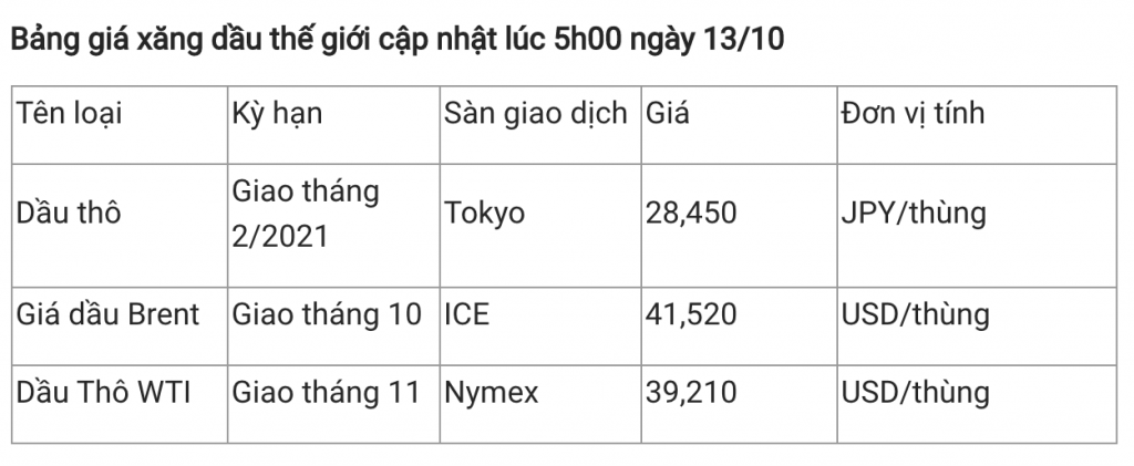 Ghi nhận vào lúc 5h (giờ Việt Nam) ngày 13/10, giá dầu thô ngọt nhẹ WTI của Mỹ ước tính đã giảm hơn 3% xuống 39,21 USD/thùng, giá dầu thô Brent ước tính giảm hơn 3% xuống 41,52 USD/thùng