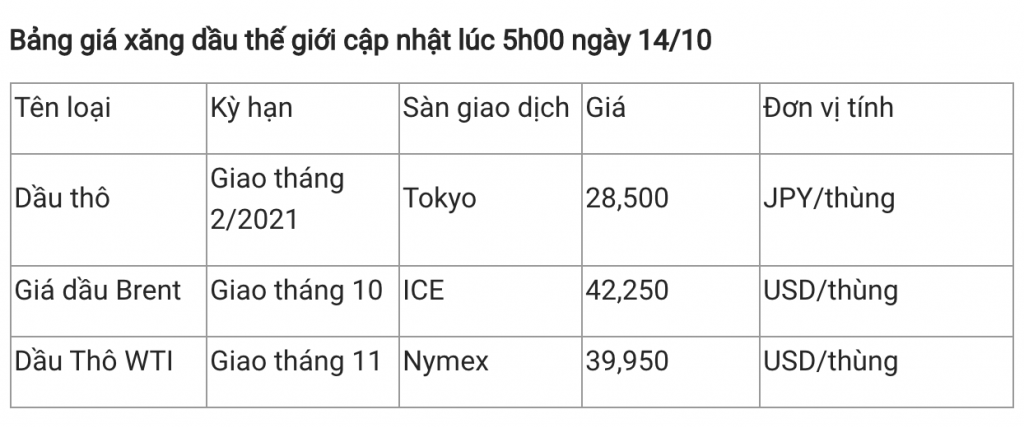 Ghi nhận vào lúc 5h (giờ Việt Nam) ngày 14/10, giá dầu thô ngọt nhẹ WTI của Mỹ ước tính đã tăng hơn 1% lên 39,95 USD/thùng, giá dầu thô Brent ước tính tăng hơn 1% lên 42,25 USD/thùng