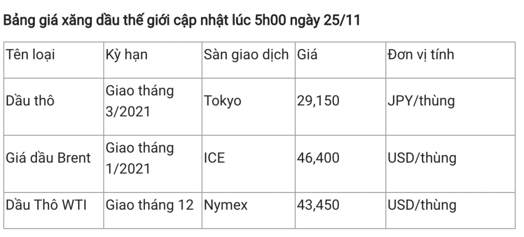Ghi nhận vào lúc 5h (giờ Việt Nam) ngày 25/11, giá dầu thô ngọt nhẹ WTI của Mỹ ước tính đã tăng hơn 1% lên 43,45 USD/thùng, giá dầu thô Brent ước tính tăng gần 1,5% lên 46,40 USD/thùng.