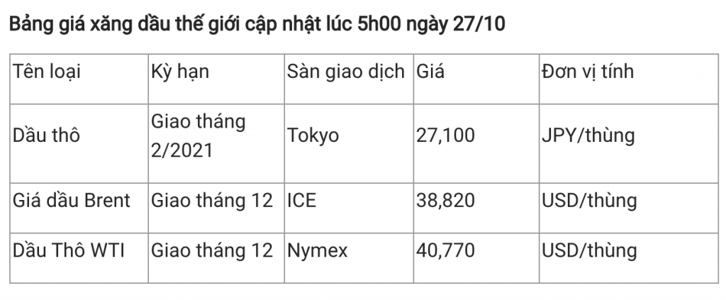 Ghi nhận vào lúc 5h (giờ Việt Nam) ngày 27/10, giá dầu thô ngọt nhẹ WTI của Mỹ ước tính đã giảm hơn 2% xuống 38,82 USD/thùng, giá dầu thô Brent ước tính giảm hơn 2% xuống 40,77 USD/thùng