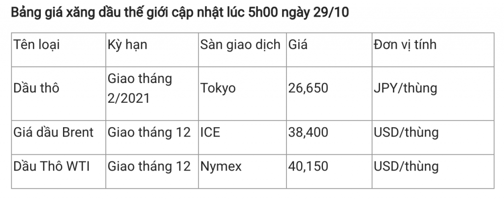 Ghi nhận vào lúc 5h (giờ Việt Nam) ngày 29/10, giá dầu thô ngọt nhẹ WTI của Mỹ ước tính đã giảm gần 3% xuống 38,40 USD/thùng, giá dầu thô Brent ước tính giảm hơn 2,5% xuống 40,15 USD/thùng.