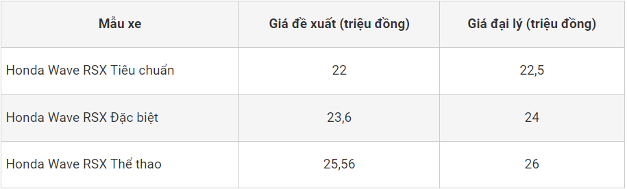 Về giá bán trong tháng 3 này, Honda Wave RSX hiện đang giữ giá rất tốt với mức giá chênh cao hơn giá niêm yết của nhà sản xuất tới vài trăm nghìn đồng. Khảo sát một HEAD Honda ở Mê Linh, Vĩnh Phúc cho thấy, các phiên bản Wave RSX hiện đang được bán ra với giá chênh tầm từ 300 nghìn đồng đến 500 nghìn đồng và mức chênh nhẹ này vẫn đem lại lợi ích lớn cho người tiêu dùng.