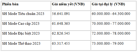 Mới đây, Honda SH Mode 2023 đã chính thức được mở bán tại đại lý với mức giá đề xuất bán lẻ dao động từ 56,6 – 63,3 triệu đồng. Tuy nhiên, do là dòng sản phẩm được nhiều khách hàng ưu chuộng, các đại lý bán SH Mode 2023 ở mức cao hơn từ 10 – 16 triệu đồng.