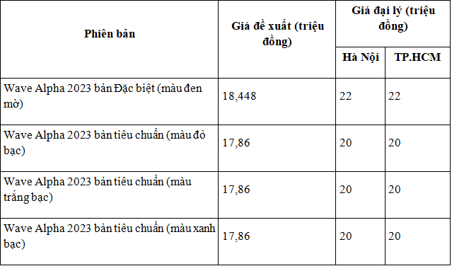 Honda Wave Alpha được sản xuất ra với nhu cầu phục vụ với người tiêu dùng tầm chung, đến nay Honda Wave Alpha đã khẳng định được vị thế của mình và được mệnh danh là “ông vua xe số” tại thị trường Việt Nam. Giá xe máy Honda Wave Alpha 2023 ngày cuối tháng đang ở mức 20-22 triệu đồng tùy từng phiên bản.