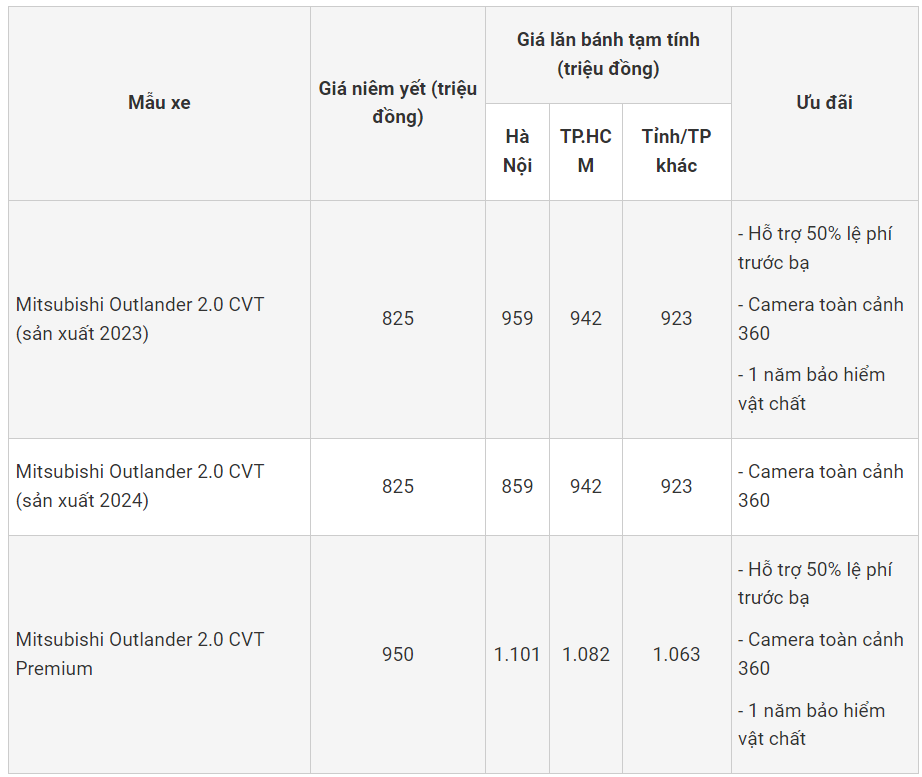 Giá lăn bánh tạm tính xe Mitsubishi Outlander tháng 3/2024