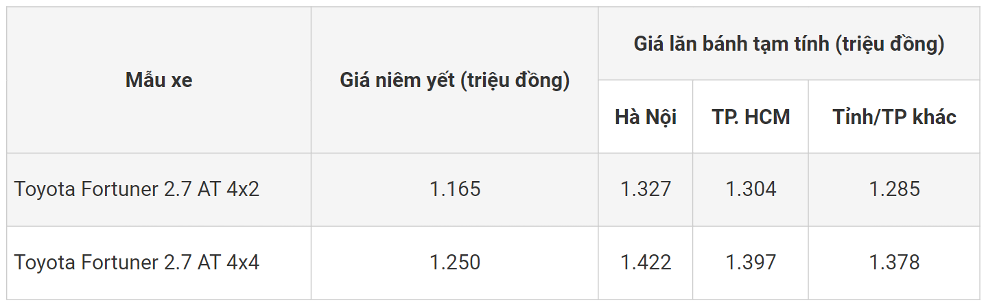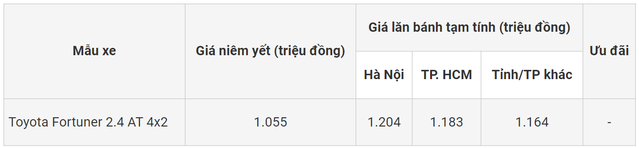 Lưu ý: Giá lăn bánh xe Toyota Fortuner 2024 mang tính chất tham khảo và thay đổi tùy thuộc tỉnh thành và chưa bao gồm khuyến mại.